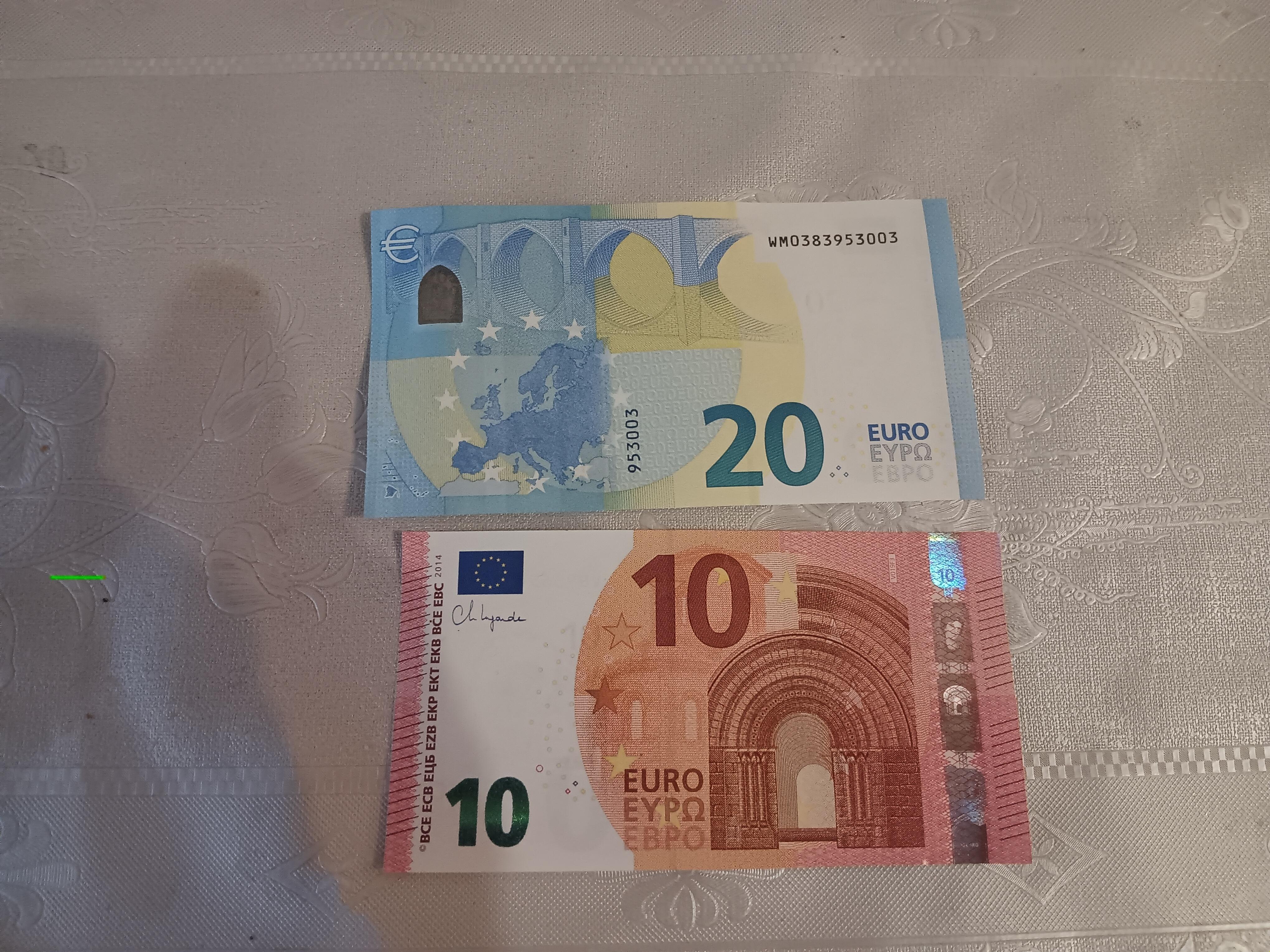 • Вижте какви пари ми дадоха за пенсията. Евро, все едно са принтирани на обикновен принтер, все едно са фалшиви, а лева беше с уникален принтер. Купих си две парчета пица за 3,30 евро, и ми върнаха в центове и стотинки, ама закръглени без превалутиране, защото не им се занимава на хората да се мъчат с тия разлики в парите. с 20 стотинки/10 цента съм назад, ама ми дреме, защото парите аз ги мразя, че толкова зло са направили по света, но съм в светския свят и няма как да не минат пари и през мен.