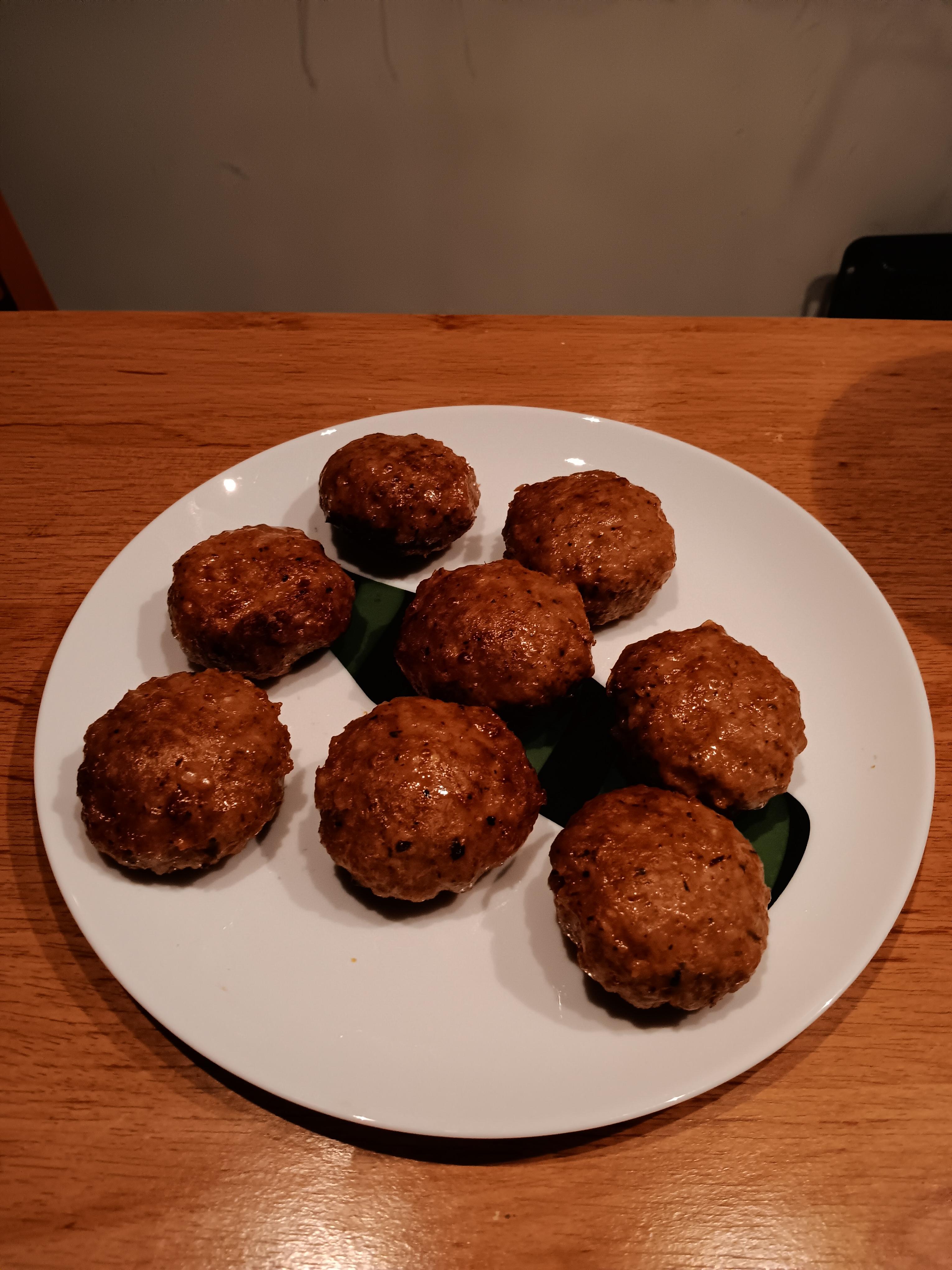 Ето вижте. Кюфтенца. Сплесках ги леко, за да се изпечат вътрешно хубаво, но те пак си станаха кръгли топченца от жегата на тостер грила. После ще ходя до магазина за пуканки, защото мама иска пуканки, и за мен биричка и цигари. 🙂✌️☀️🌙